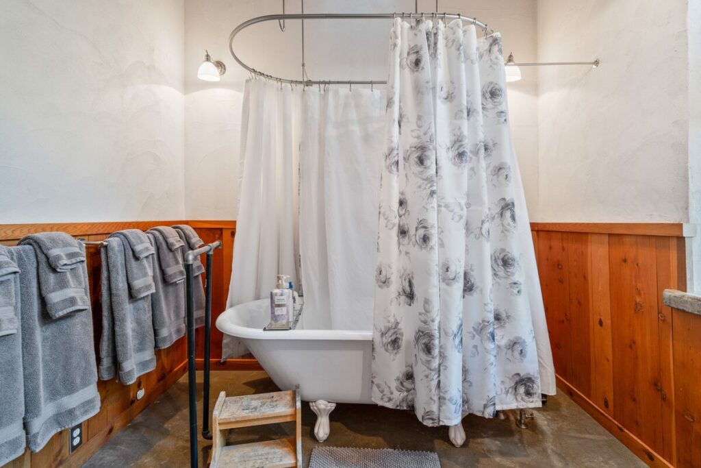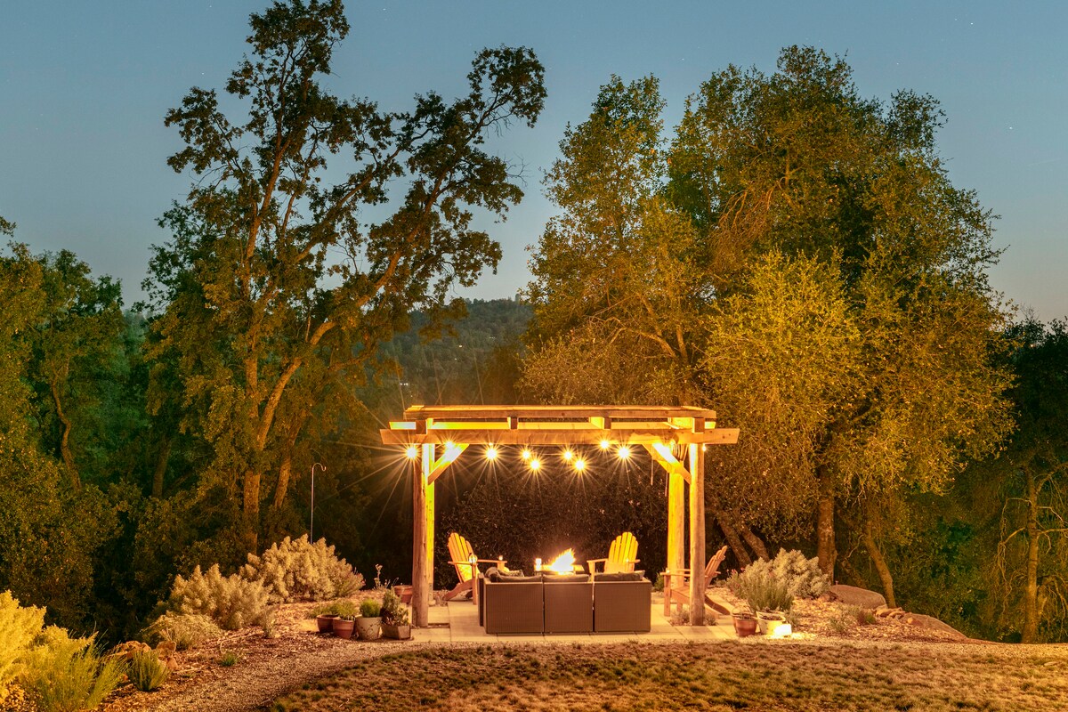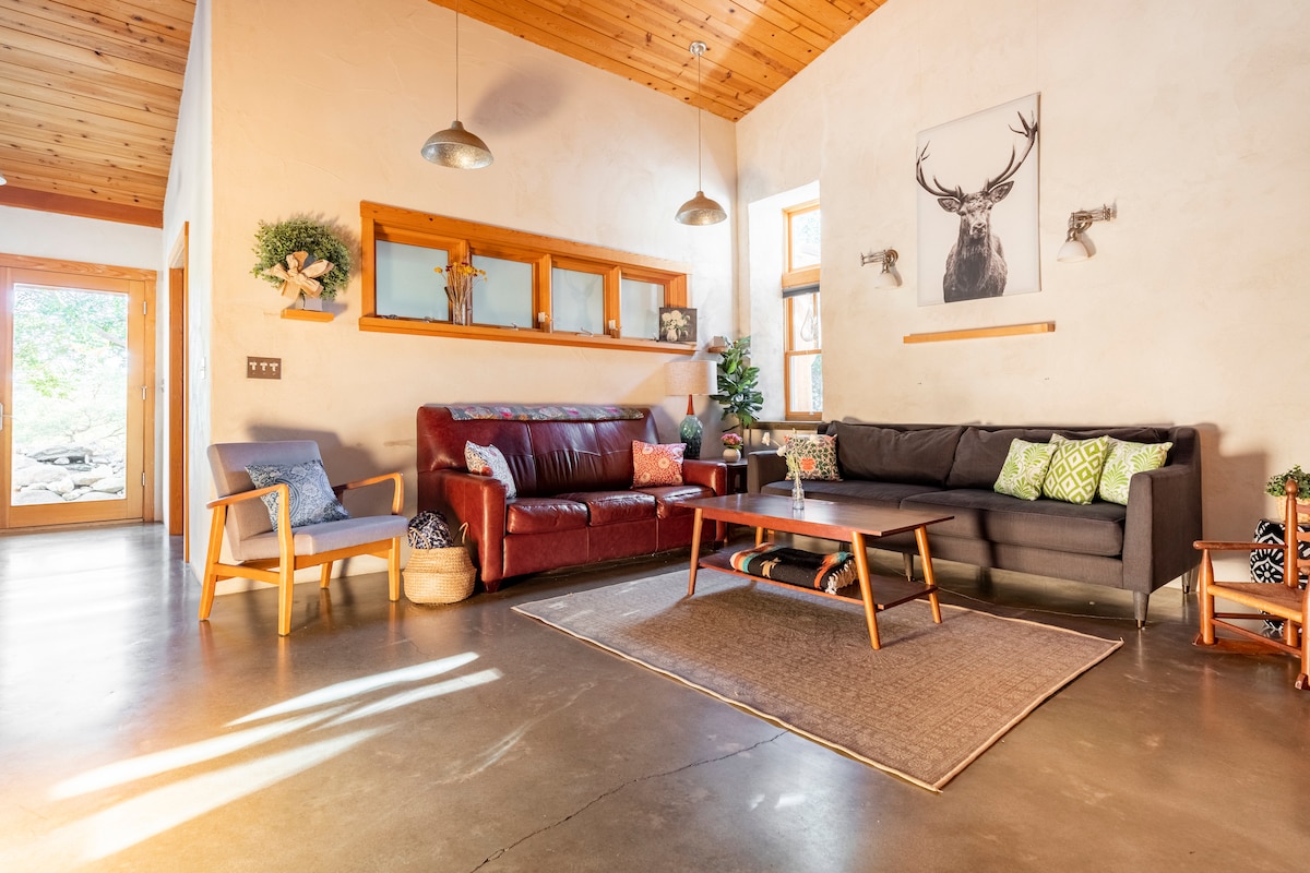 The house sits on 5 acres of golden hills, oak trees, wildflowers, a seasonal pond, and a creek. You’ll find several outdoor gathering spots for quiet reflection or group meals, plus lawn games like ring toss, Cornhole, and ladderball.
