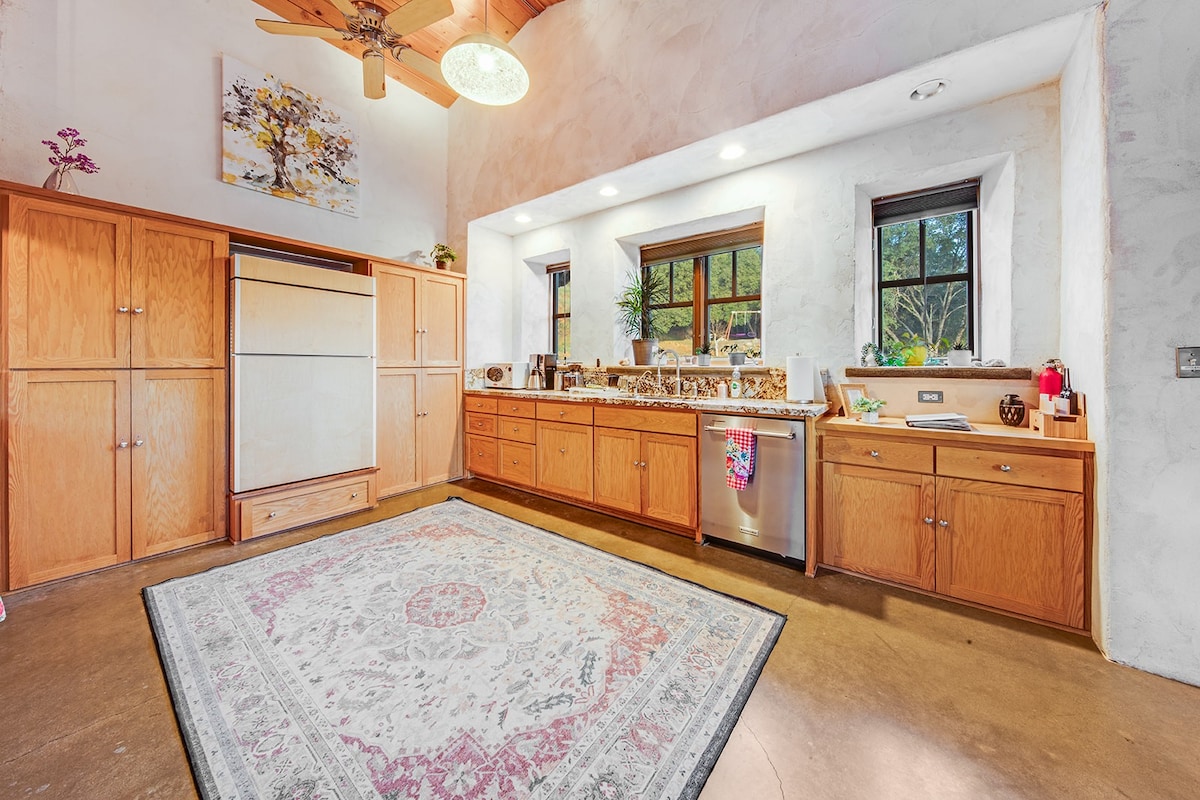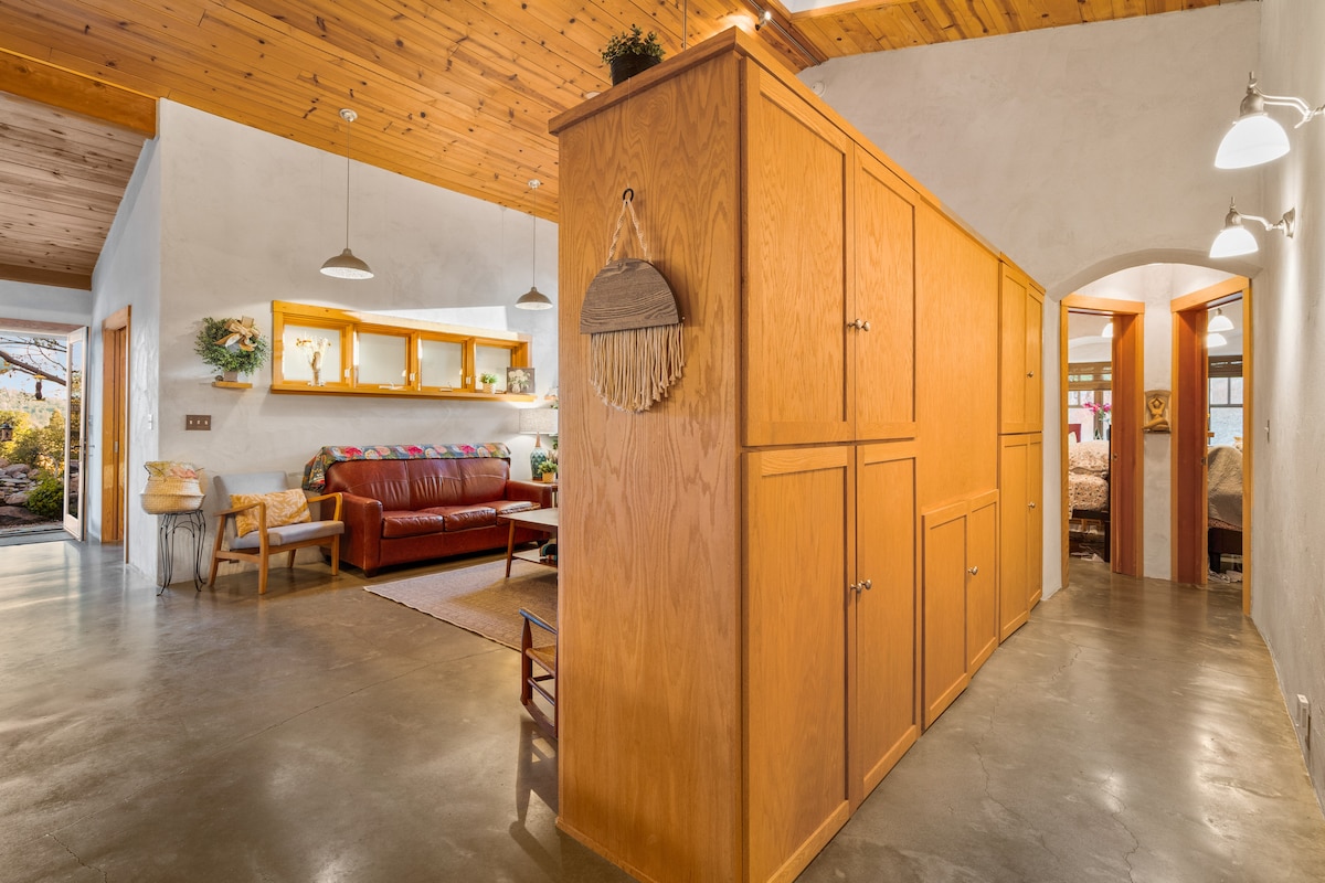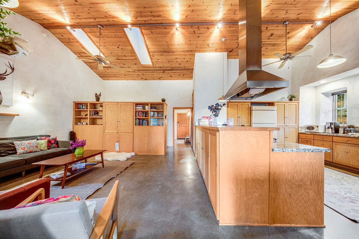 The large, warm and inviting living space is filled with natural light and features thick concrete floors with solar radiant heating that keeps you warm in the winter and cool in summer.