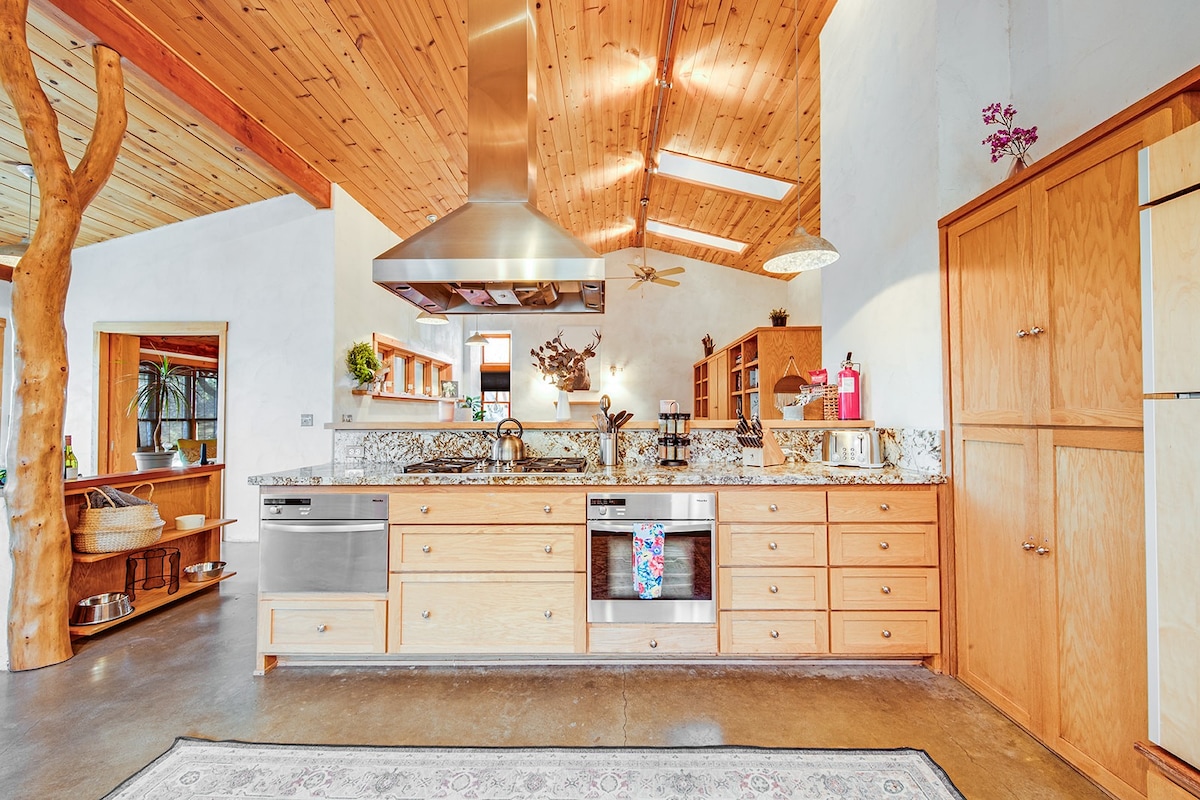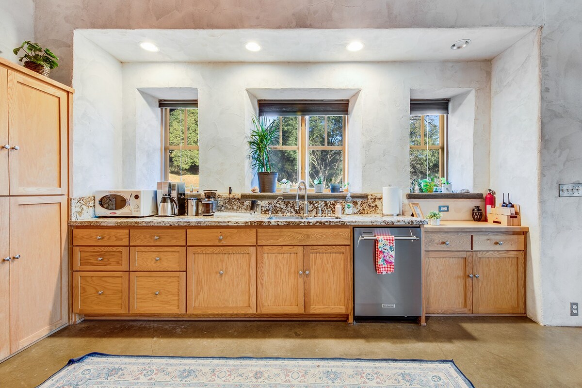 This handcrafted straw bale home was designed with sustainability and comfort in mind. The thick, straw bale walls naturally regulate temperature year-round, while large windows fill each room with natural light and views of nature from each room.